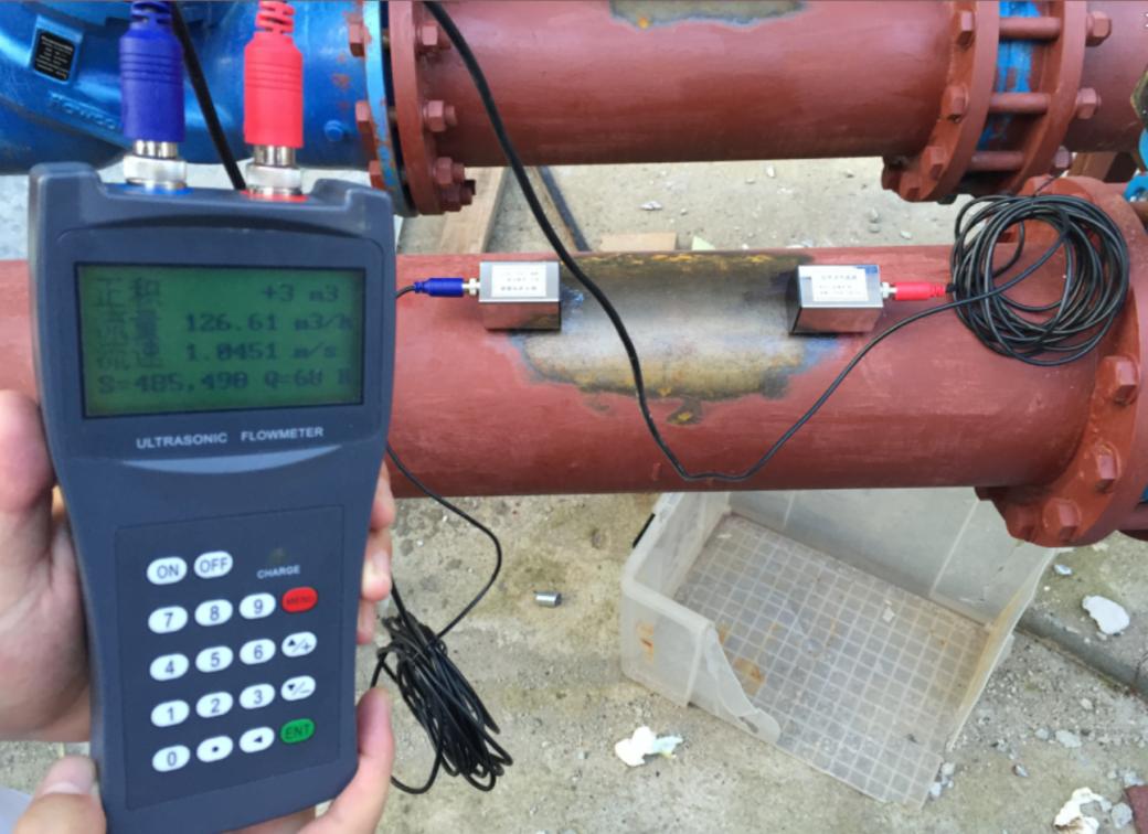 采用超聲波流量計,依據管路條件,輸入管道參數,依次設定測試儀器各參數值,選取測試段,采用鋼絲球,打磨管道至露出金屬色,依據儀器要求的探頭安裝距離,設置探頭位置,采用V法測量,確定測量系統管道取點處管道流速,根據系統管道流速來調整水泵開啟臺數,系統清洗流速不得小于1.5m/s。